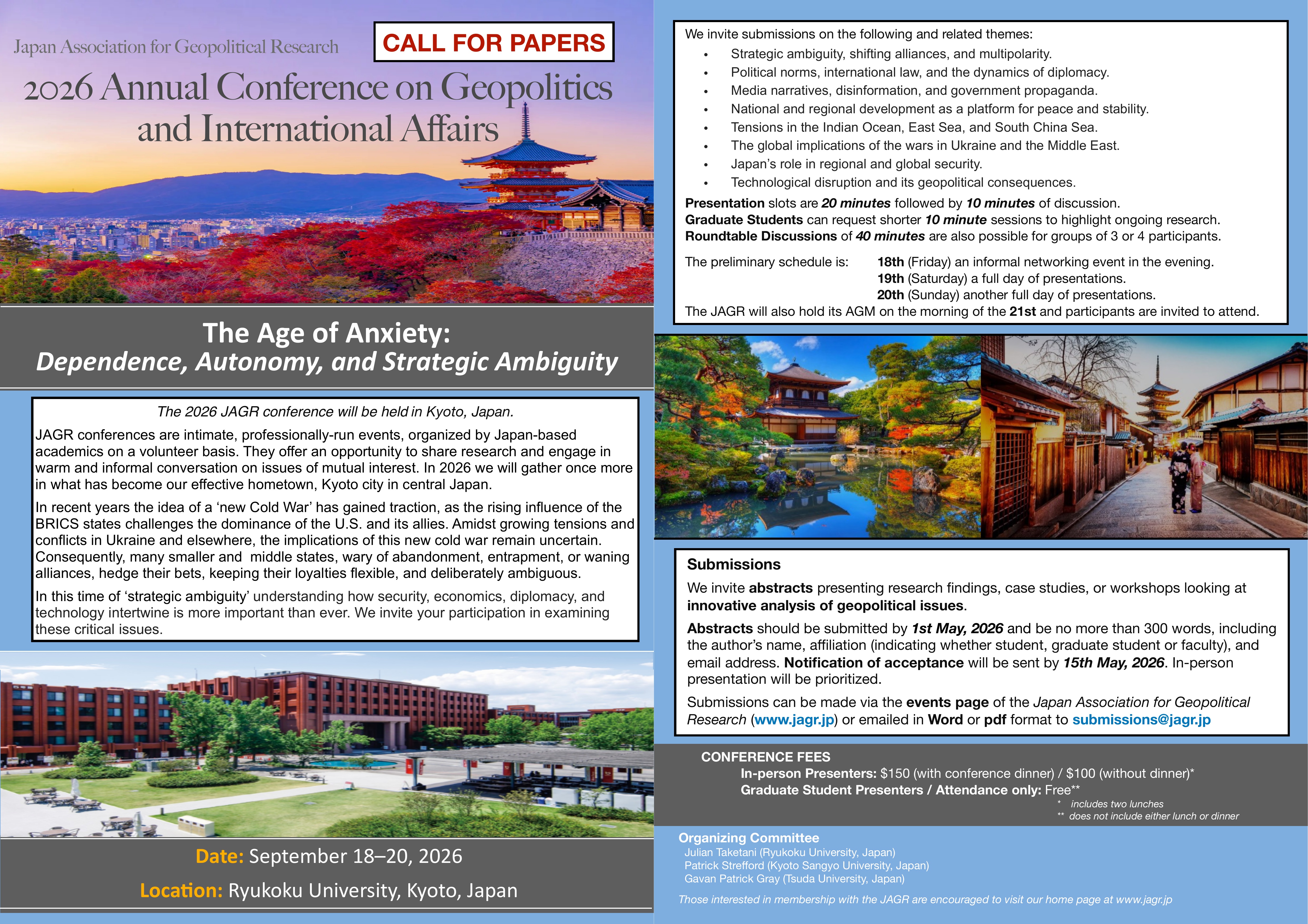 Call for submissions: 2026 JAGR Annual Conference on Geopolitics and International Affairs; Japan, September 18-20